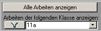Setzen Sie einen Filter: Das Programm kann Ihnen entweder nur eine Arbeit anzeigen (Standard). Die Navigationsbuttons [4] haben aber erst einen Sinn, wenn man den Filter auf eine Klasse (wählen Sie irgendeine Klasse aus der Drop-Down-Liste aus) oder auf "alle Arbeiten anzeigen" setzt. Im ersten Fall kann man sich mit den Navigationsbuttons zwischen allen Benotungen einer Klasse bewegen, im letzteren Fall kann man alle bisher eingetragenen Benotungen durchgehen.
