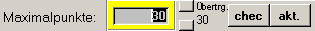 Hier geben Sie die Maximalpunktezahl Ihrer Arbeit ein. Voreingestellt ist die Summe der Punkte der nicht freiwilligen Aufgaben. Weichte der Maximalpunktewert von diesem Vorgabewert ab, wird er in roter Farbe dargestellt. Rechts steht immer der Übertrag des Vorgabewertes aus dem vorhergehenden Arbeitenformular. Mit den beiden Buttons rechts neben dem gelb unterlegten Maximal-Punkte-Feld können Sie die Punktzahl um je einen Punkt erhöhen, bzw. vermindern. Eine Maximale Punktzahl muss angegeben werden, wenn Schulnoten2002 Notenvorschläge machen soll! Eine interessante Funktion bietet der unscheinbare "chec"-Button: Verringern Sie bei einer sehr schlecht ausgefallenen Arbeit die maximale Punktzahl und klicken Sie dann "chec"-Button. Es öffnet sich ein kleines Fenster "Notenspiegelvergleich", aus dem Sie ersehen können, wie sich die eingegebene Verringerung der Maximalpunkte auf den Notenspiegel auswirken würde. Wenn Sie "OK" anklicken, werden die Werte in die grauen Felder des nebenstehenden Notenspiegels der Arbeit eingetragen und Sie können dann schön sehen, wie er sich gegenüber dem aktuellen Notenspiegel verändern würde.